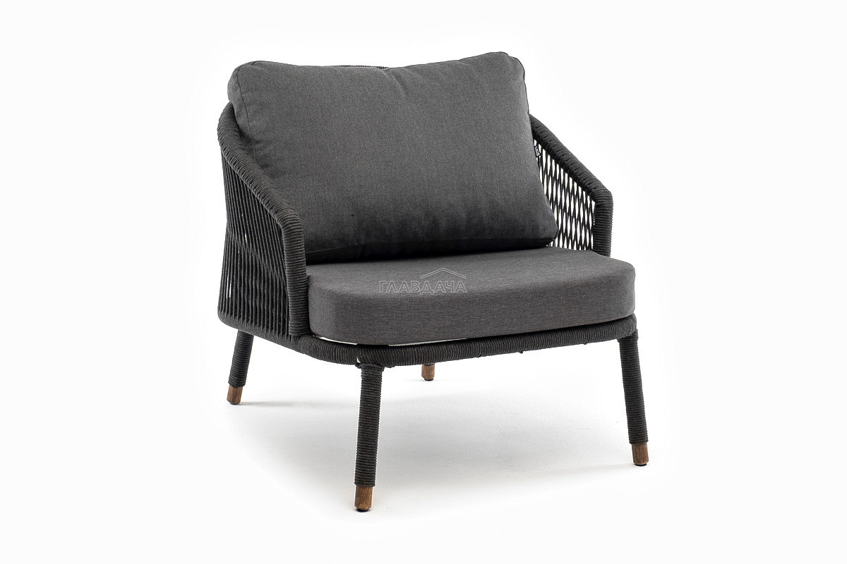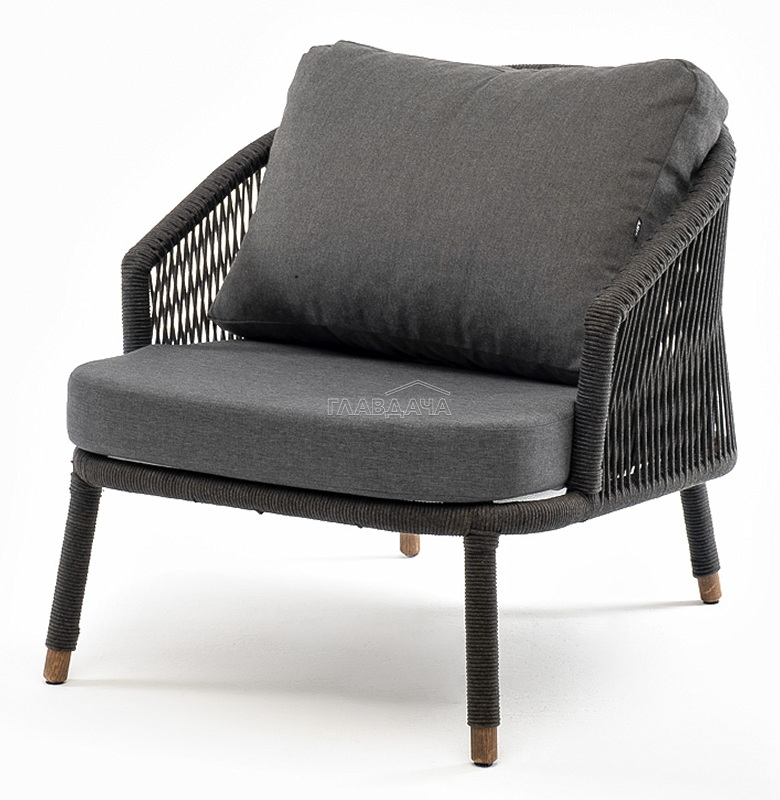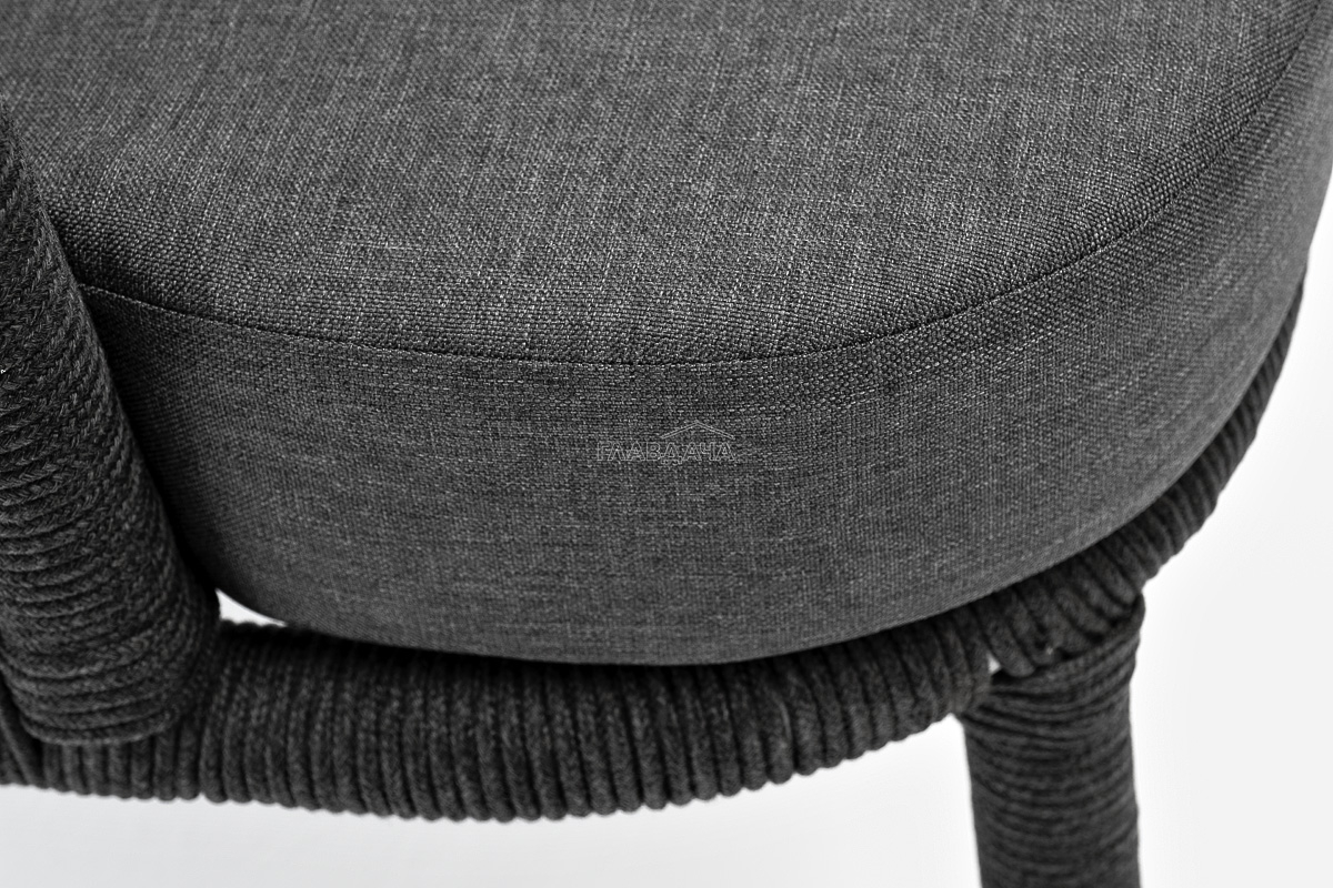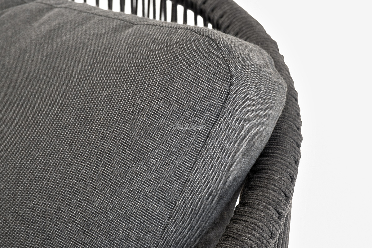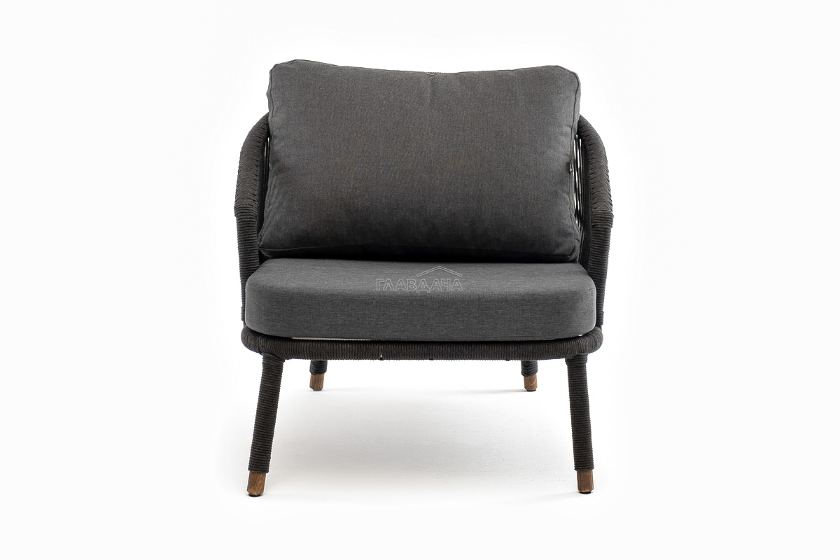 Кресло имеет алюминиевый каркас, окрашенный порошковой краской в темно-серый (RAL7024) цвет. Боковины каркаса вручную оплетены роупом - эластичными синтетическими лентами, изготовленными из высокопрочных полиэфирных волокон. Цвет оплетки - темно-серый. На ножках кресла идут дубовые наконечники (заглушки).
