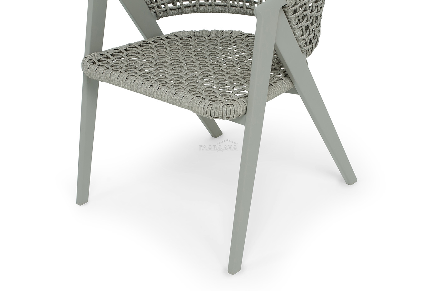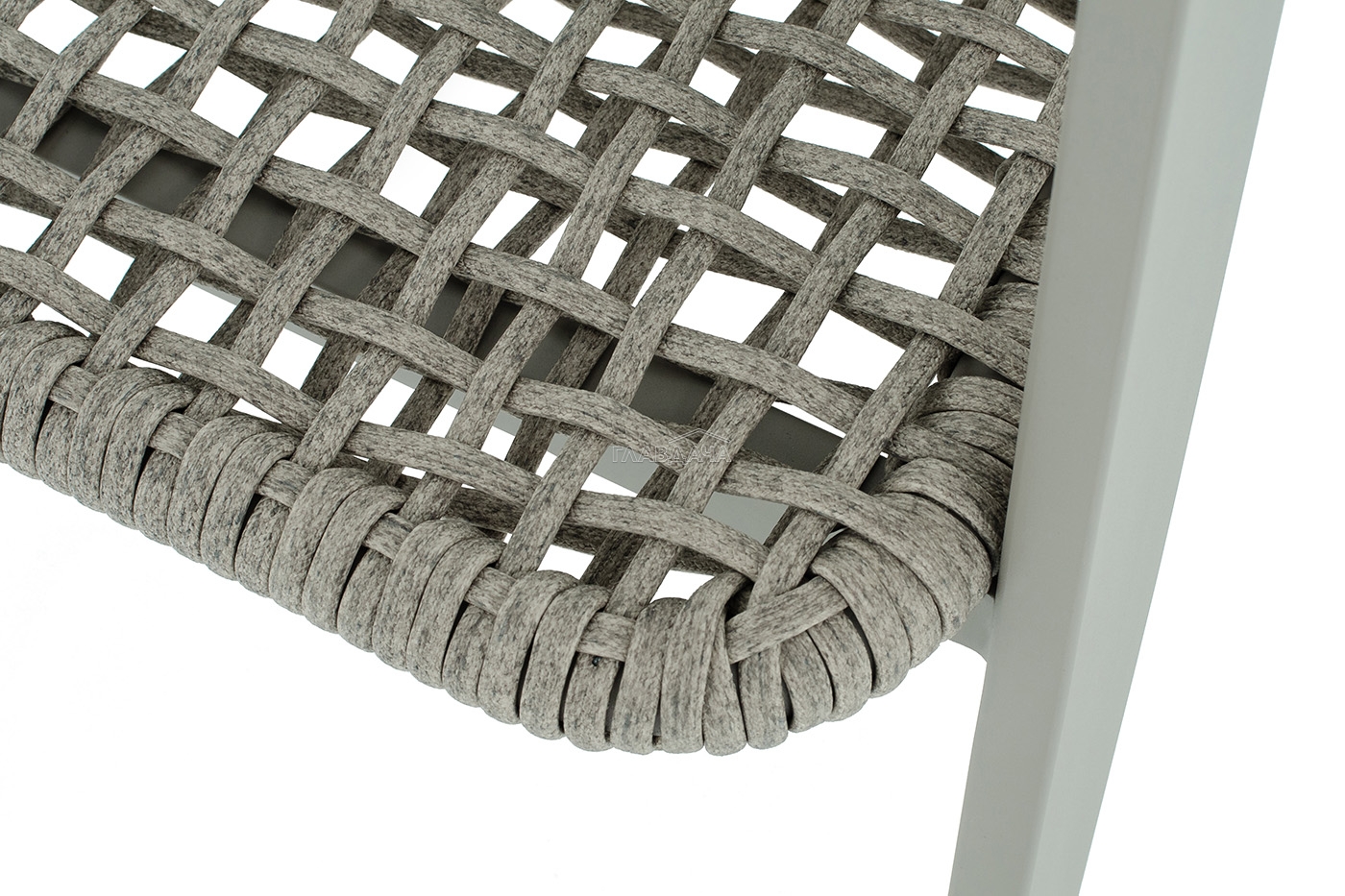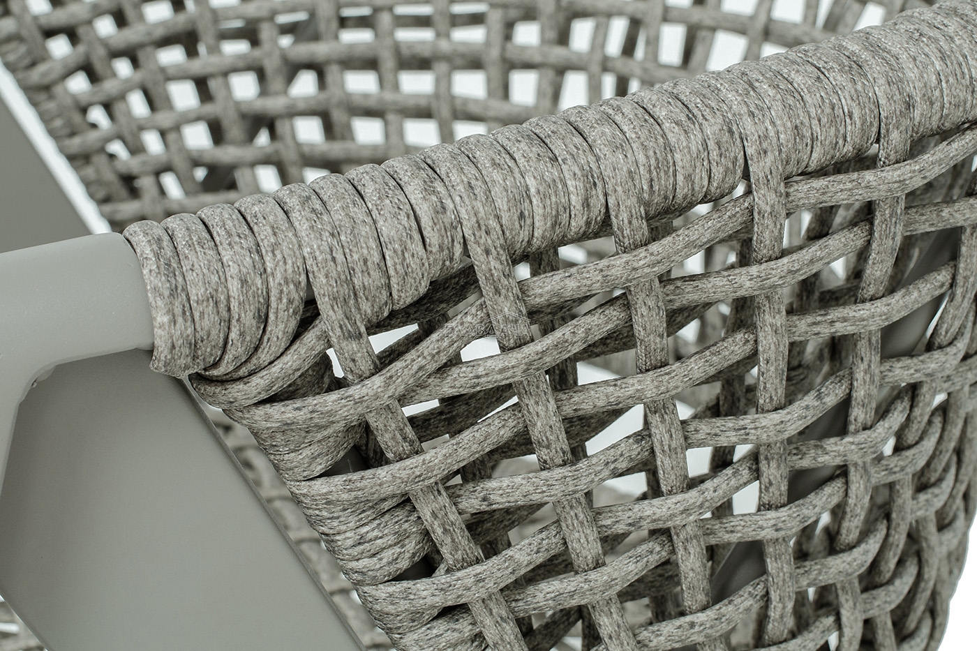 Изготовлен из алюминиевого каркаса, оплетенного вручную эластичными синтетическими лентами из высокопрочных полиэфирных волокон. Роуп является гипоаллергенным, прочным, износостойким и устойчивым к ультрафиолету. Приятный на ощупь и напоминает шерстяное плетение. Цвет каркаса и оплетки – серый. На ножках стула идут серые пластиковые наконечники (заглушки).