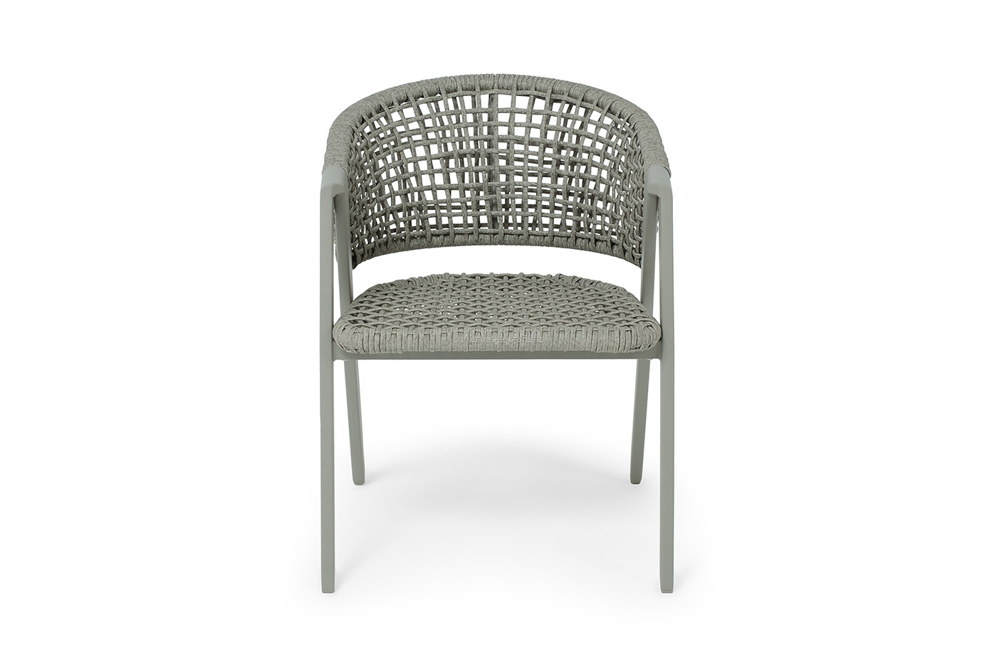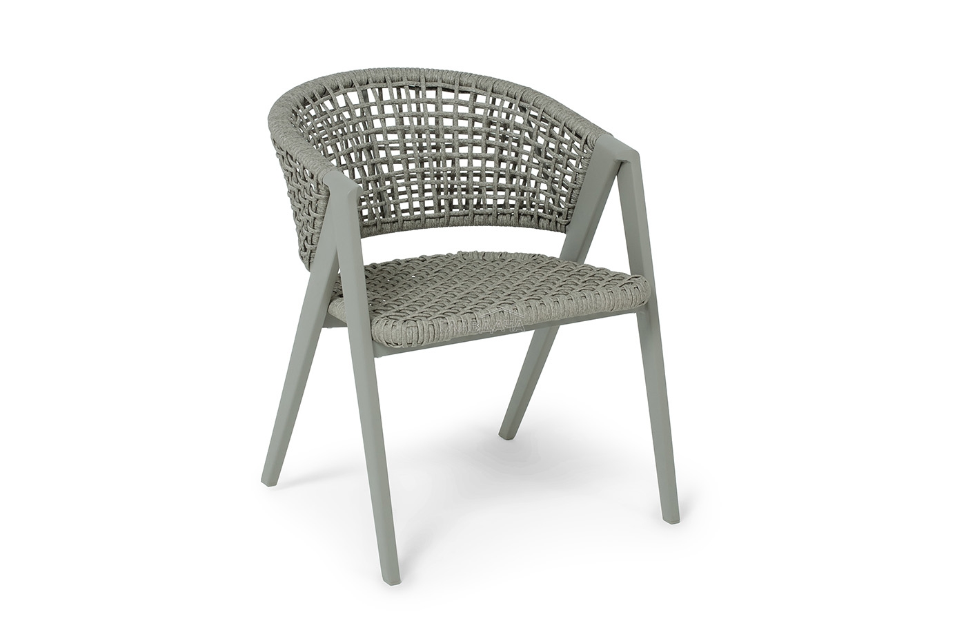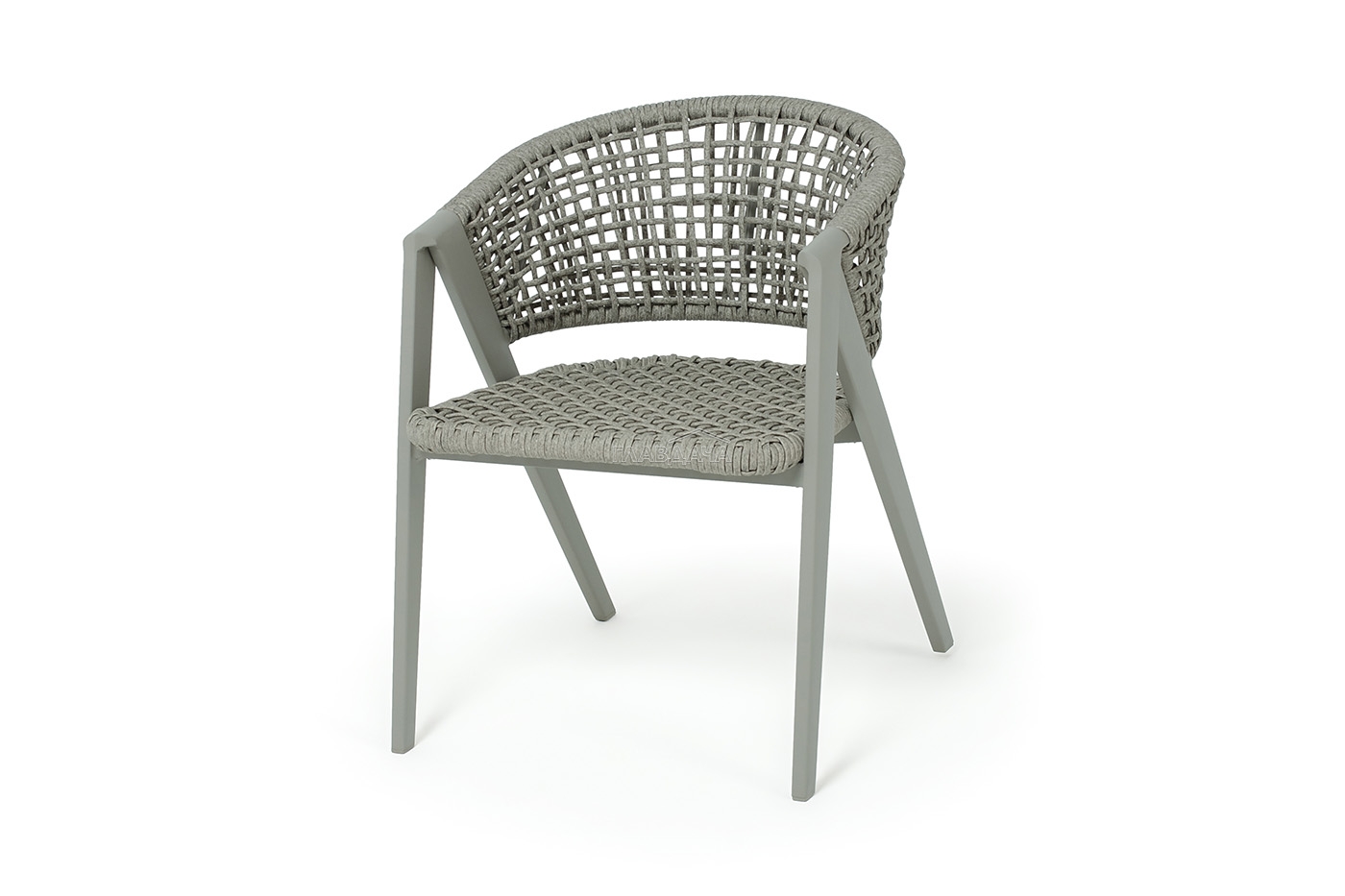 Изготовлен из алюминиевого каркаса, оплетенного вручную эластичными синтетическими лентами из высокопрочных полиэфирных волокон. Роуп является гипоаллергенным, прочным, износостойким и устойчивым к ультрафиолету. Приятный на ощупь и напоминает шерстяное плетение. Цвет каркаса и оплетки – серый. На ножках стула идут серые пластиковые наконечники (заглушки).
