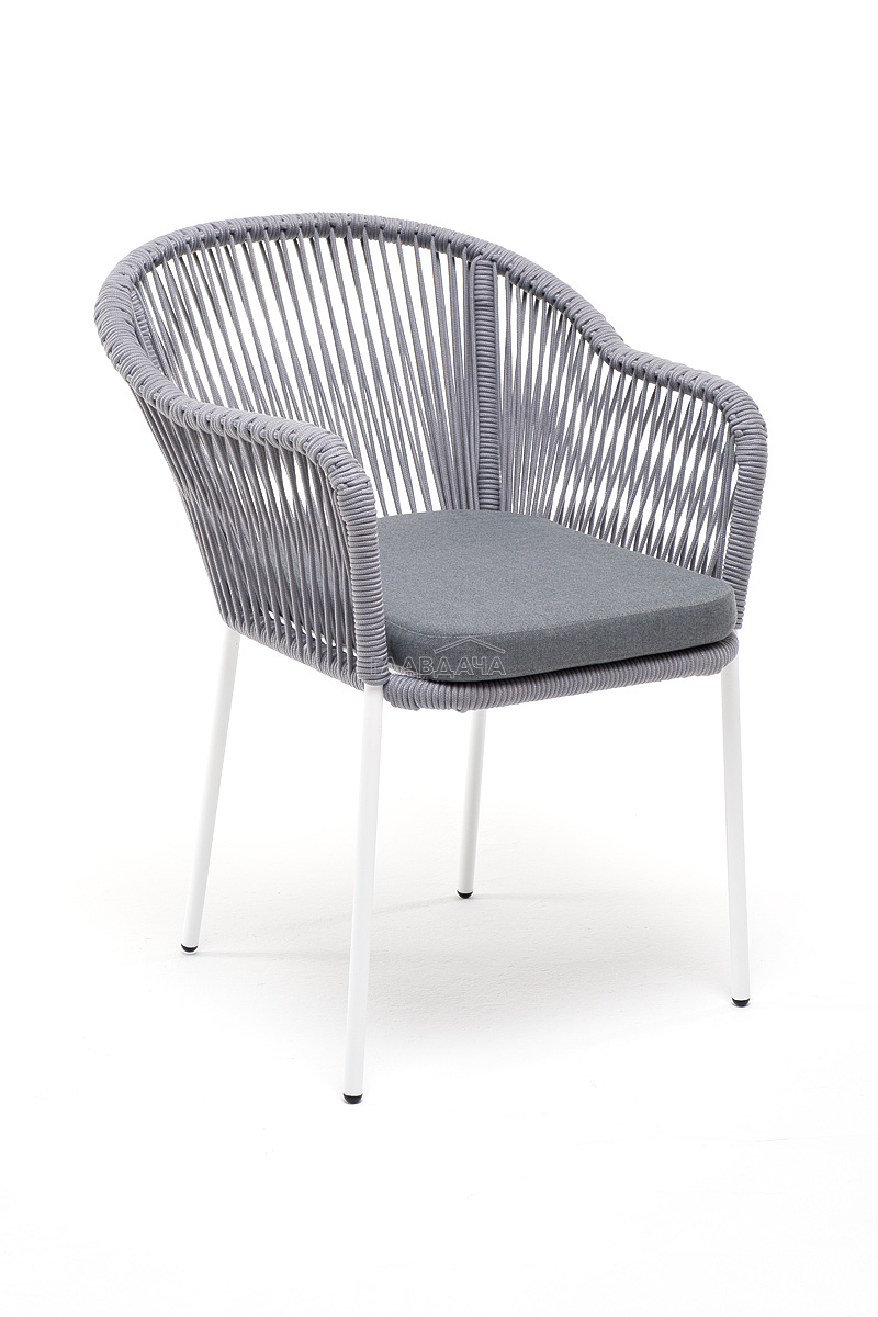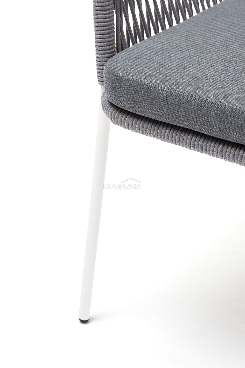 Стальной каркас белого цвета гарантирует прочность и надежность, а плетение из эластичных лент высокопрочных полиэфирных волокон светло-серого оттенка создает удобное и уютное сидение.