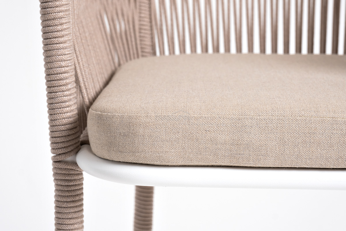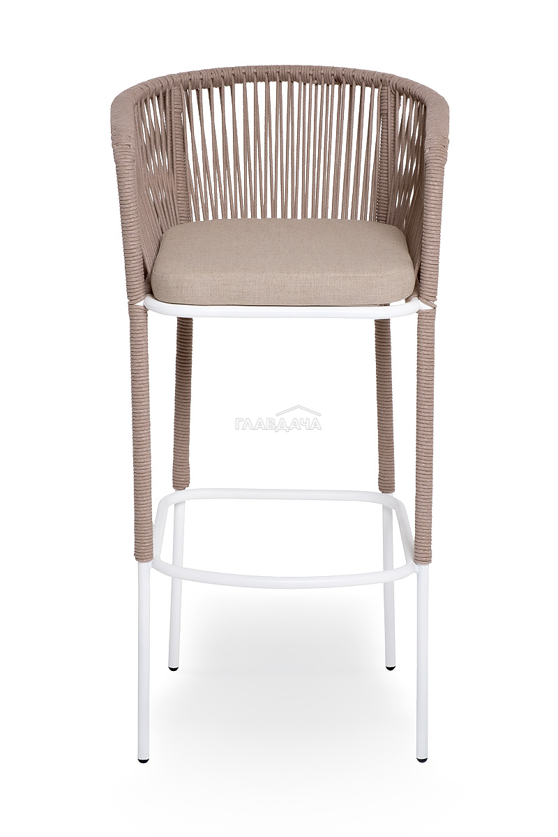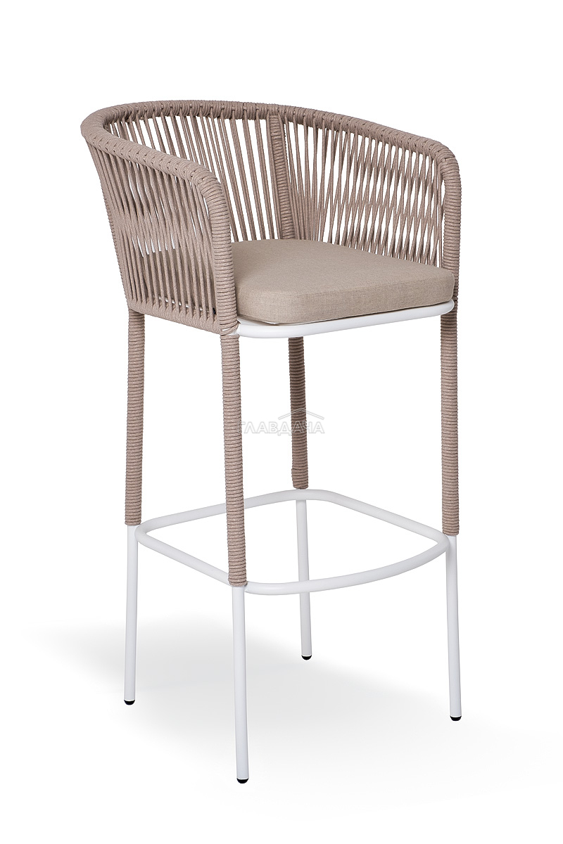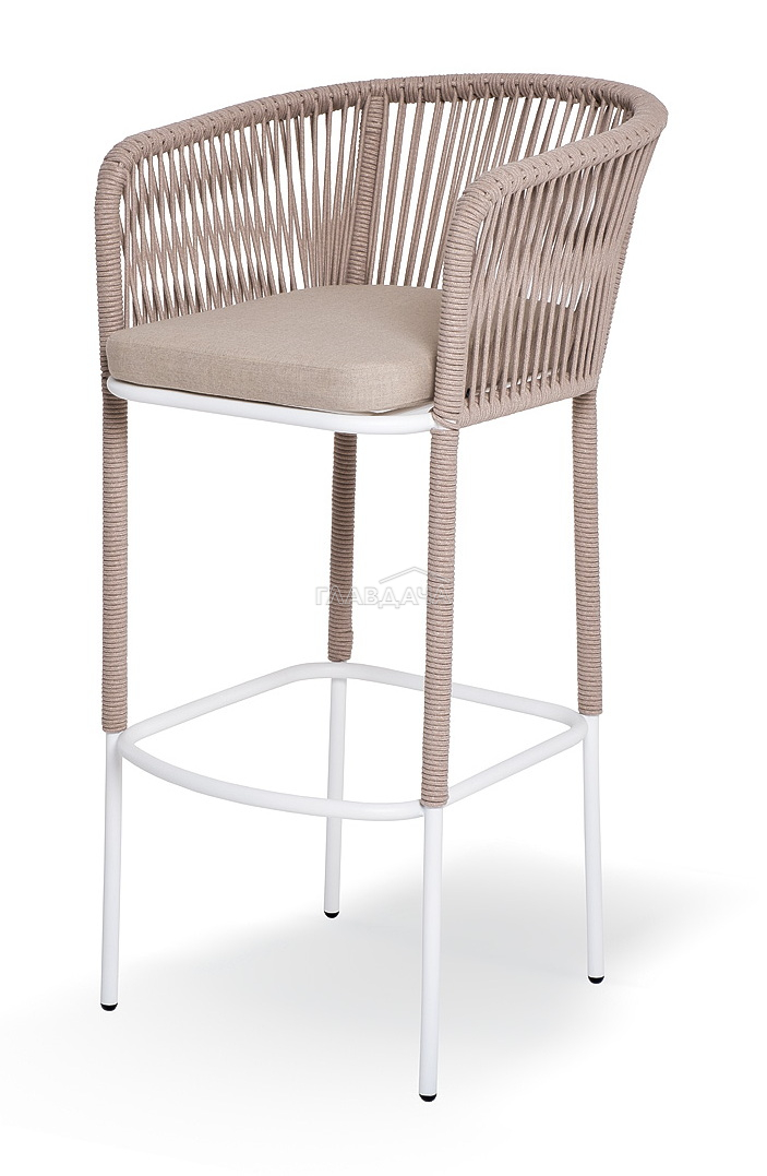 Барный стул «Марсель» представлен в стальном каркасе белого (RAL9016) цвета, оплетен вручную эластичными синтетическими лентами из высокопрочных полиэфирных волокон, бежевого оттенка, размер стула: 590×510×1070 мм. Высота сидения без подушки – 730 мм.