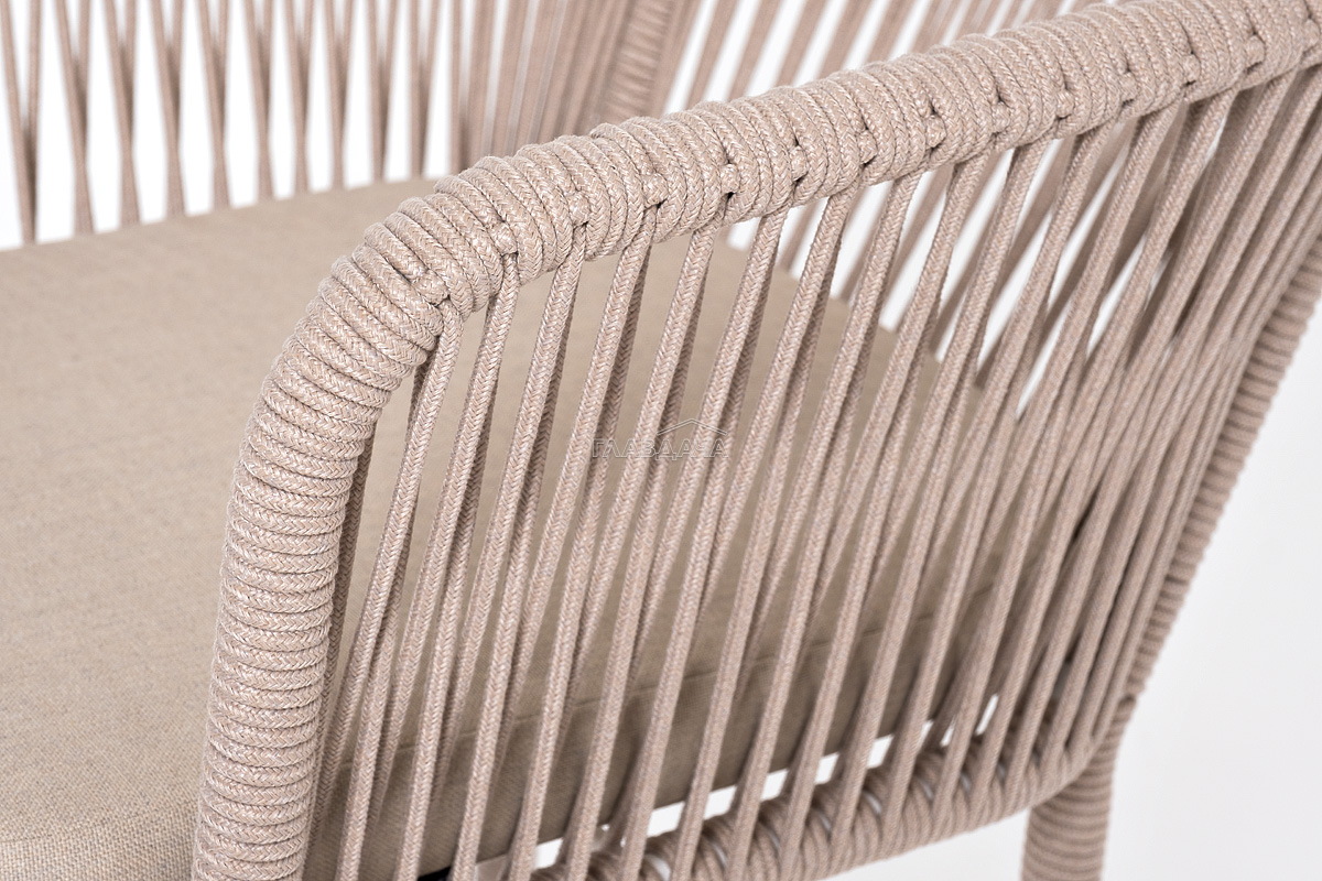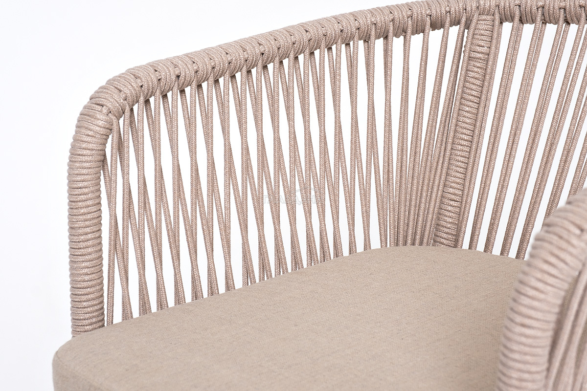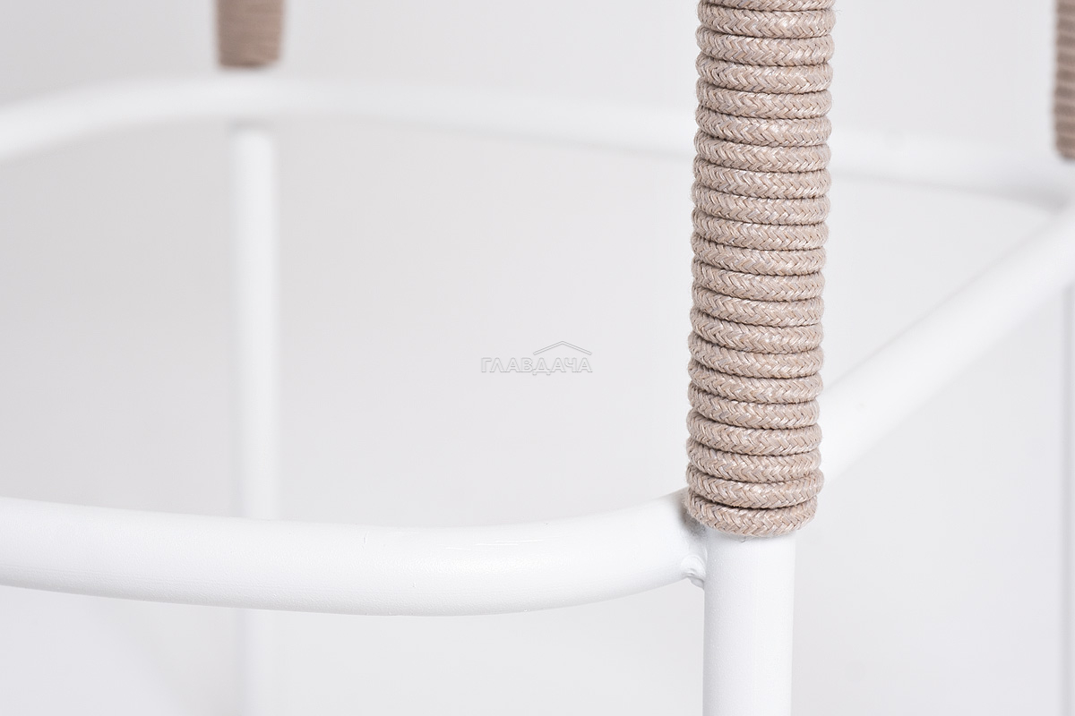 Барный стул «Марсель» представлен в стальном каркасе белого (RAL9016) цвета, оплетен вручную эластичными синтетическими лентами из высокопрочных полиэфирных волокон, бежевого оттенка, размер стула: 590×510×1070 мм. Высота сидения без подушки – 730 мм.