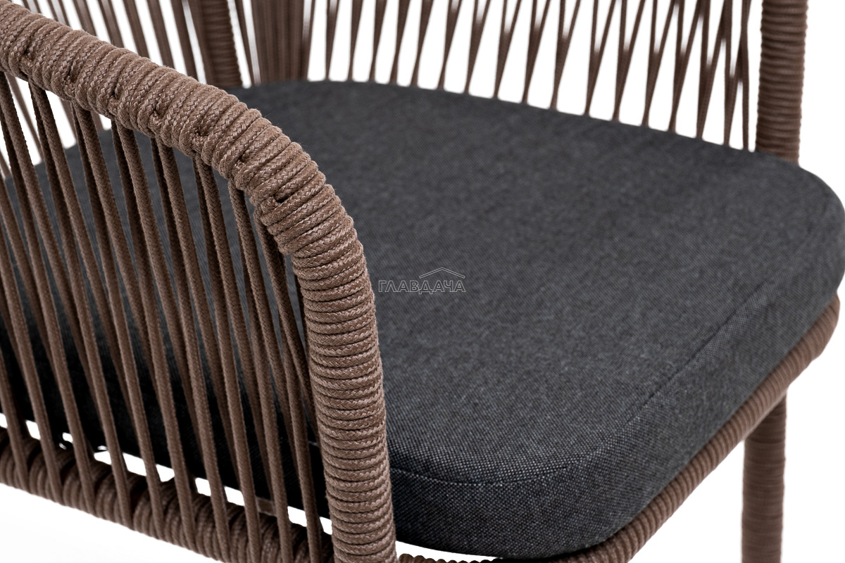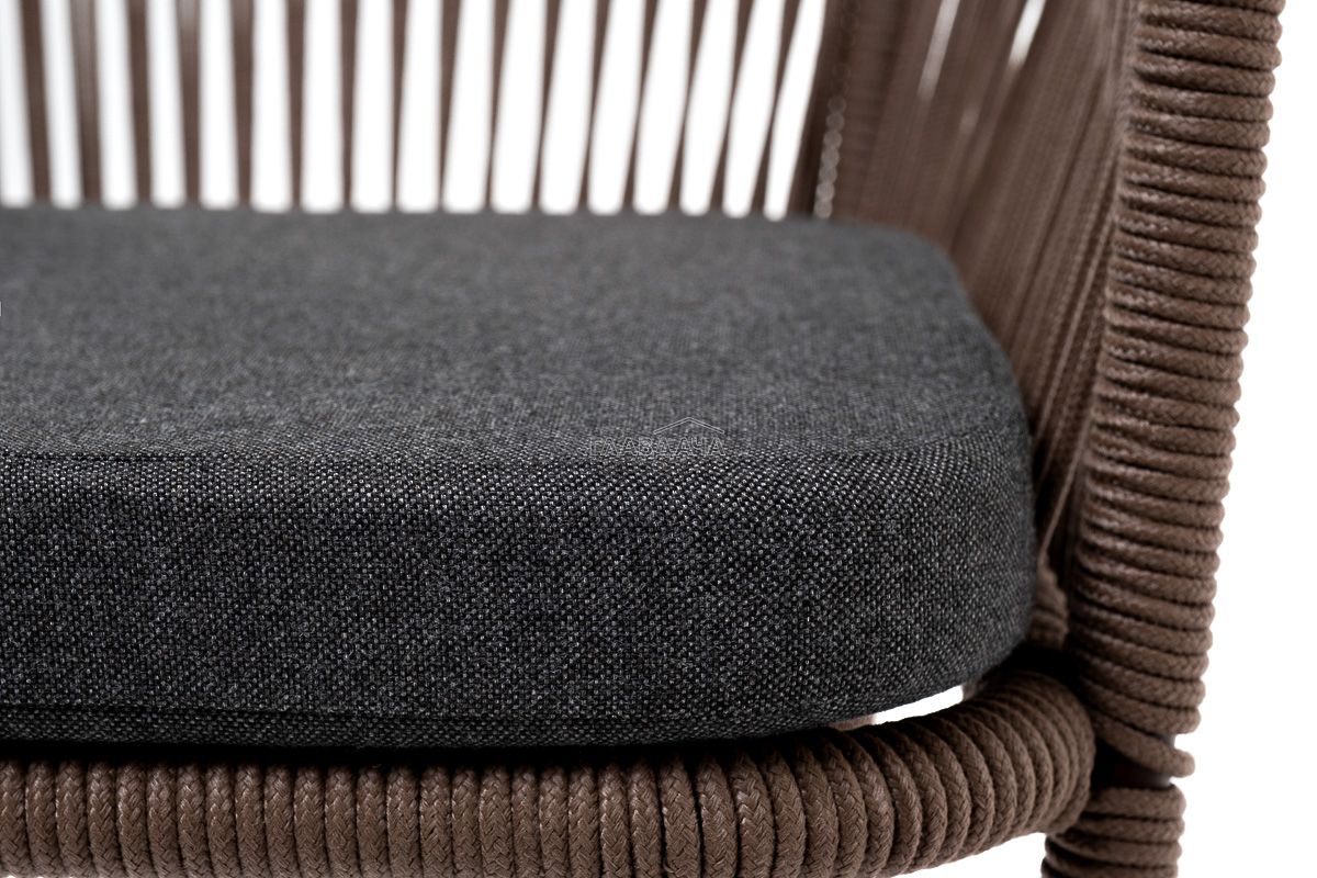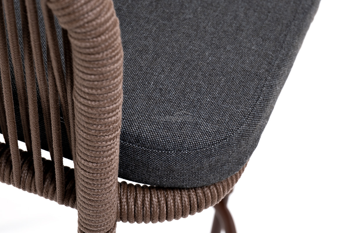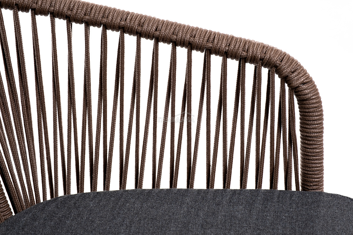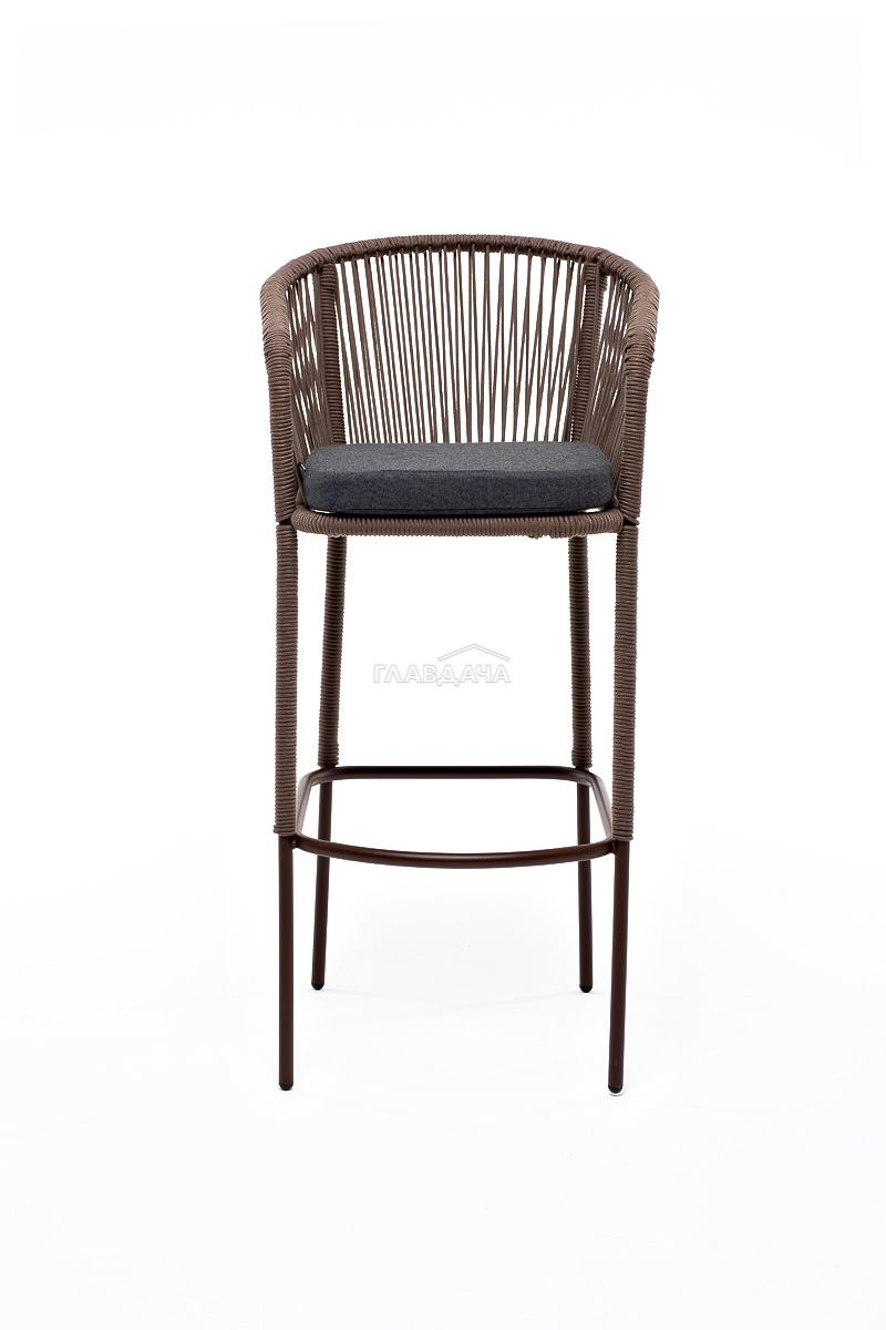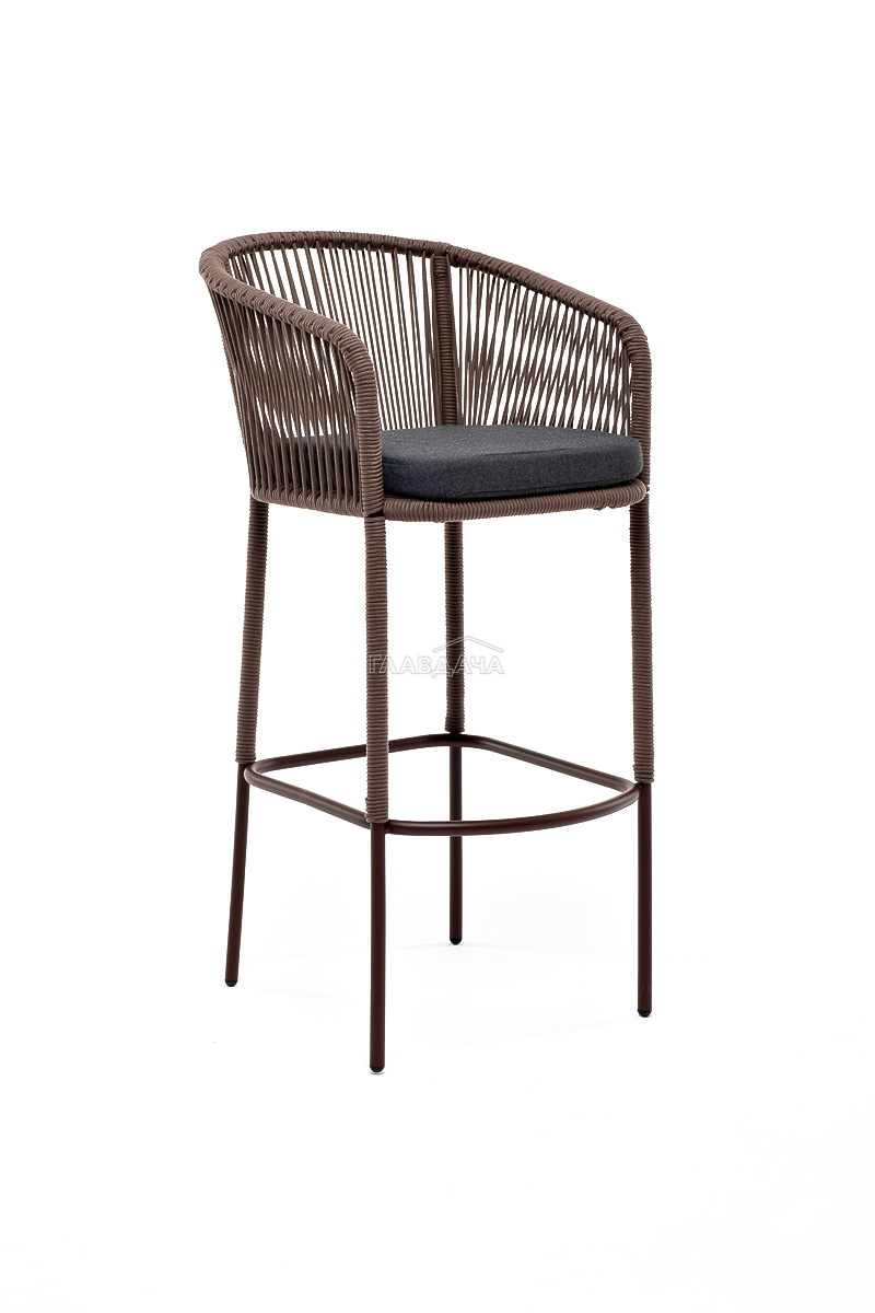 Барный стул «Марсель» представлен в стальном каркасе коричневого (RAL8016) цвета, оплетен вручную эластичными синтетическими лентами из высокопрочных полиэфирных волокон, коричневого оттенка, размер стула: 590×510×1070 мм.