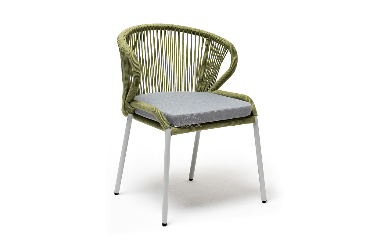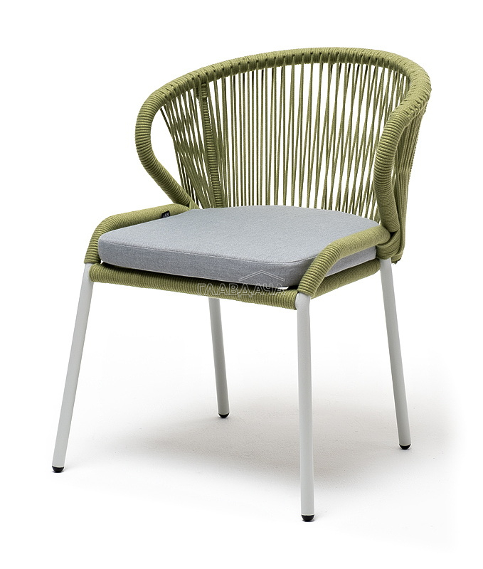 Изготовлен из алюминиевого каркаса, оплетенного вручную эластичными синтетическими лентами из высокопрочных полиэфирных волокон (роуп круглый). Цвет каркаса - светло-серый (RAL7035), оплетки - салатовый меланж.