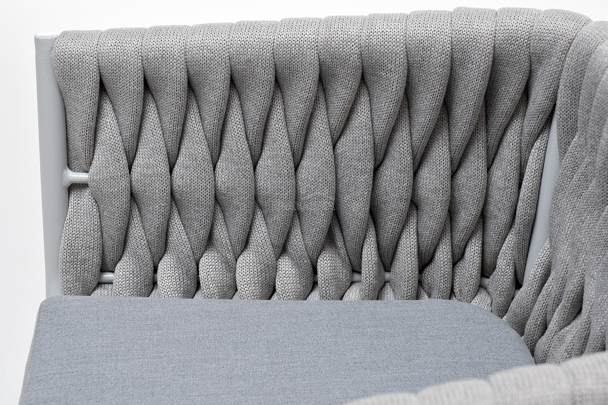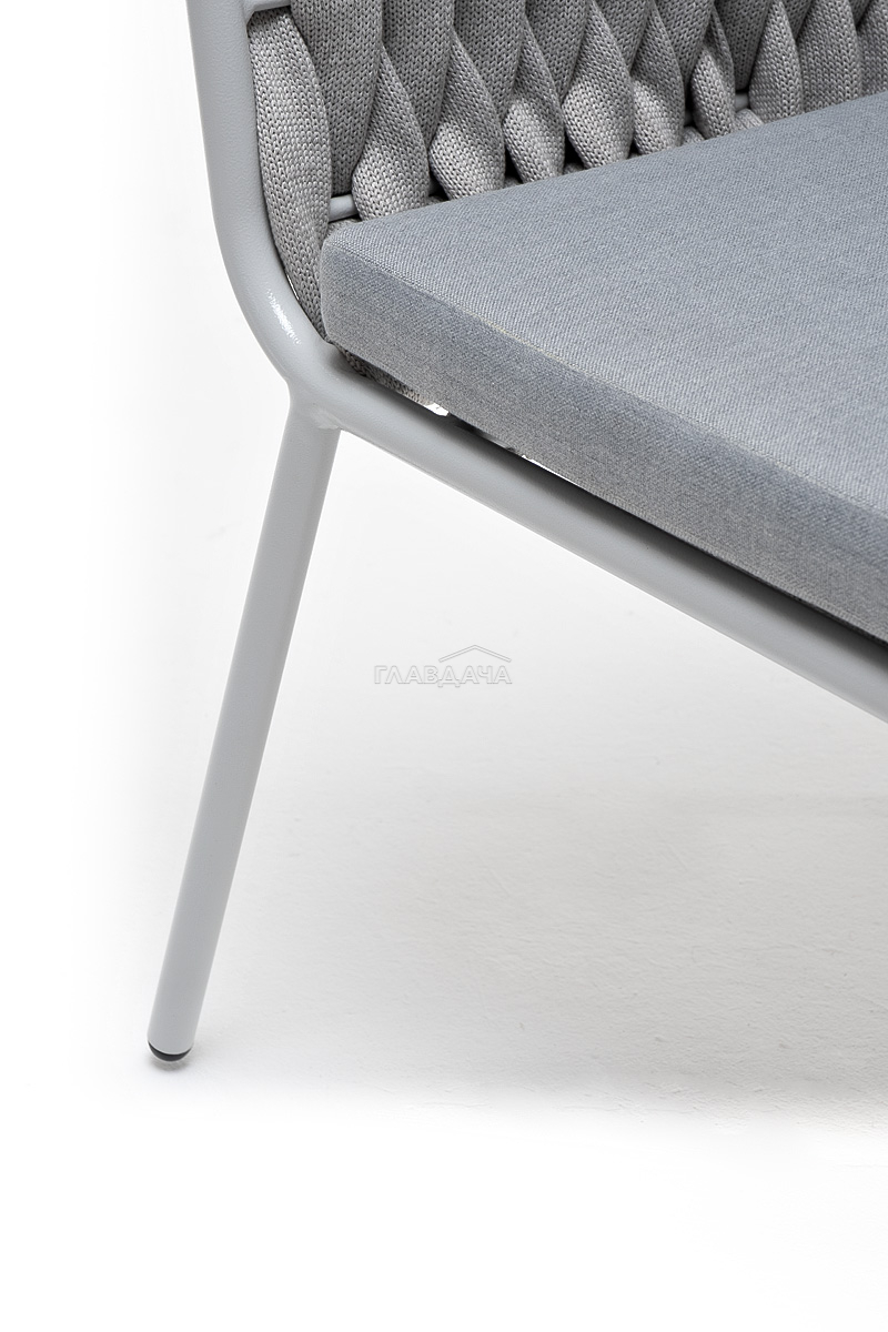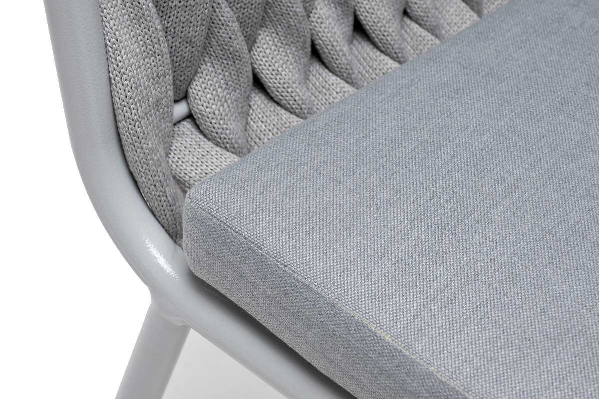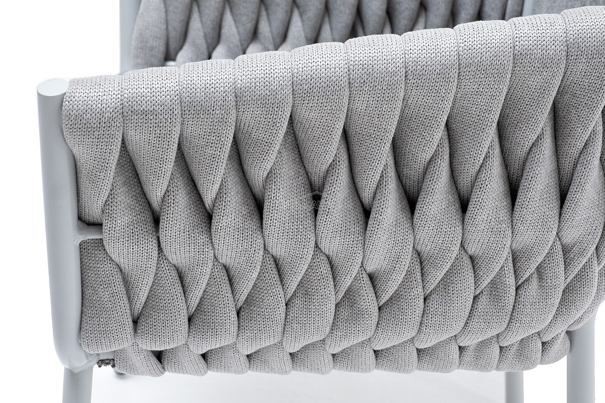 Стул «Монако» изготовлен из алюминиевого каркаса окрашенный порошковой краской в светло-серый (RAL7035) цвет. Боковины каркаса вручную оплетены роупом - эластичными синтетическими лентами, изготовленными из высокопрочных полиэфирных волокон. Цвет оплетки – светло-серый.