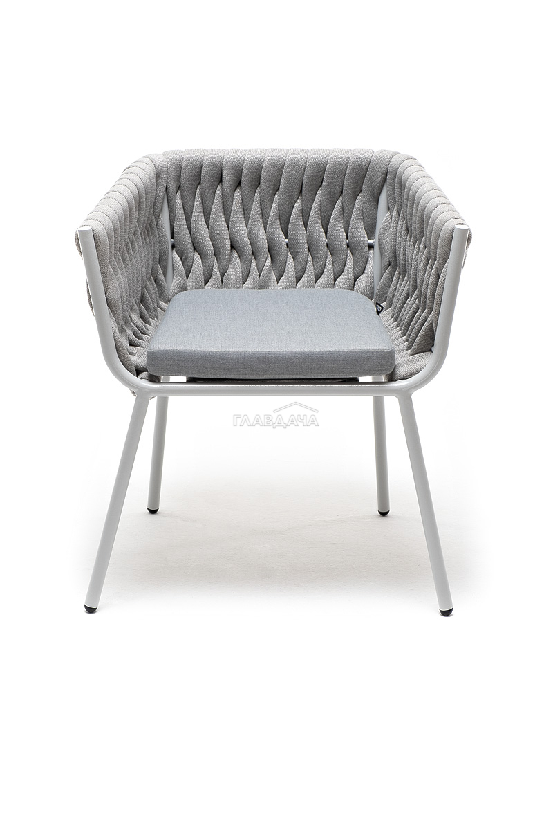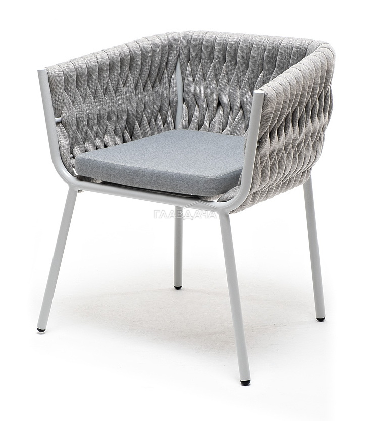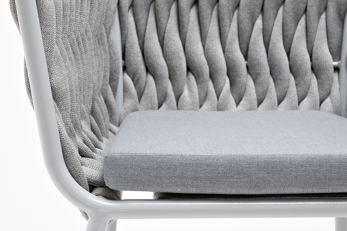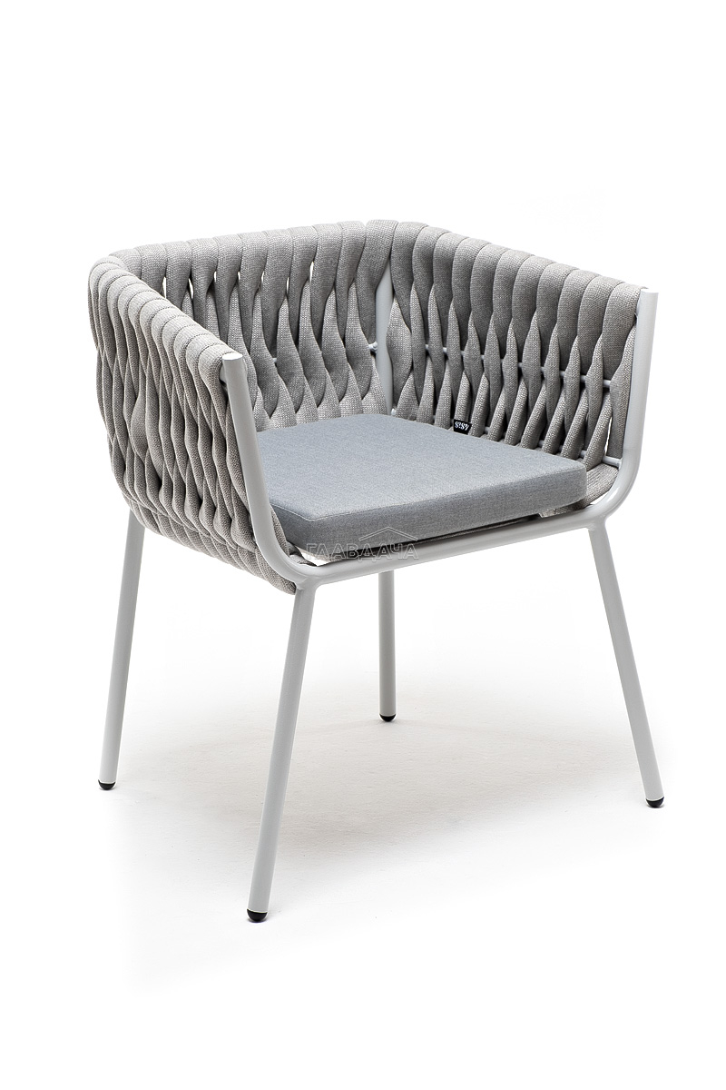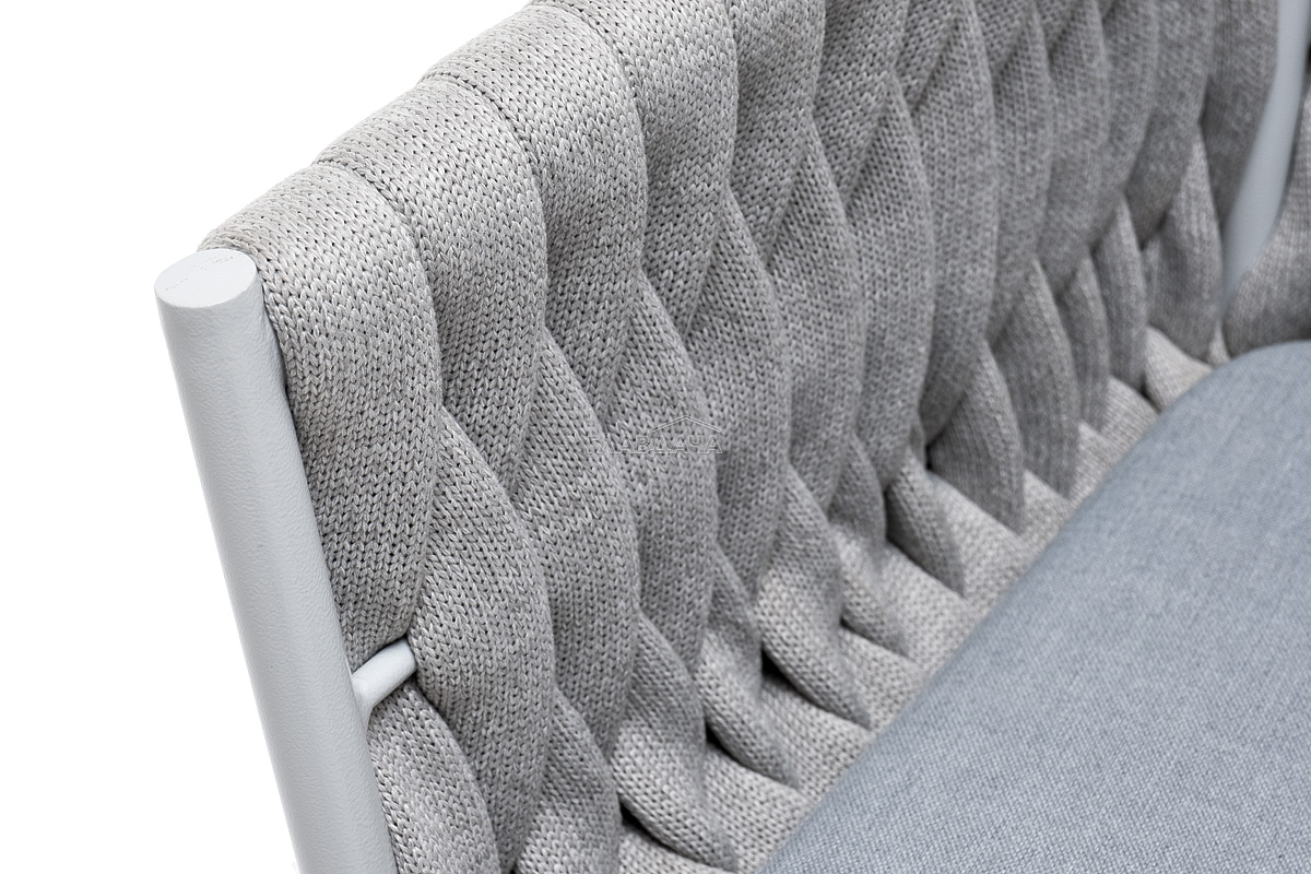 Стул «Монако» изготовлен из алюминиевого каркаса окрашенный порошковой краской в светло-серый (RAL7035) цвет. Боковины каркаса вручную оплетены роупом - эластичными синтетическими лентами, изготовленными из высокопрочных полиэфирных волокон. Цвет оплетки – светло-серый.