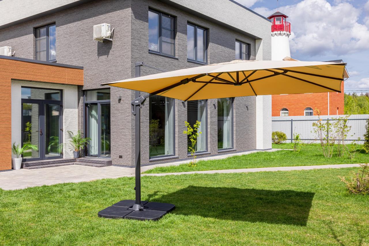 Квадратный уличный зонт SKY в бежевом цвете. Этот зонт имеет алюминиевую ногу и основание из плит, выполненных из высококачественного пластика, заполненного изнутри бетоном, что обеспечивает надежную устойчивость даже в ветреную погоду.